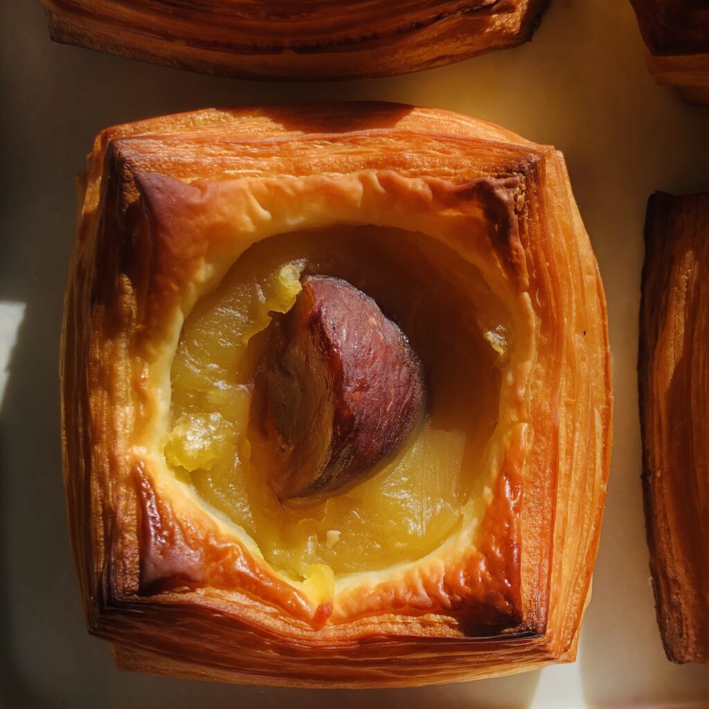 【マロンデッシュ】(写真上)デニッシュ生地に栗あんと栗の渋皮煮を入れた秋らしい一品です