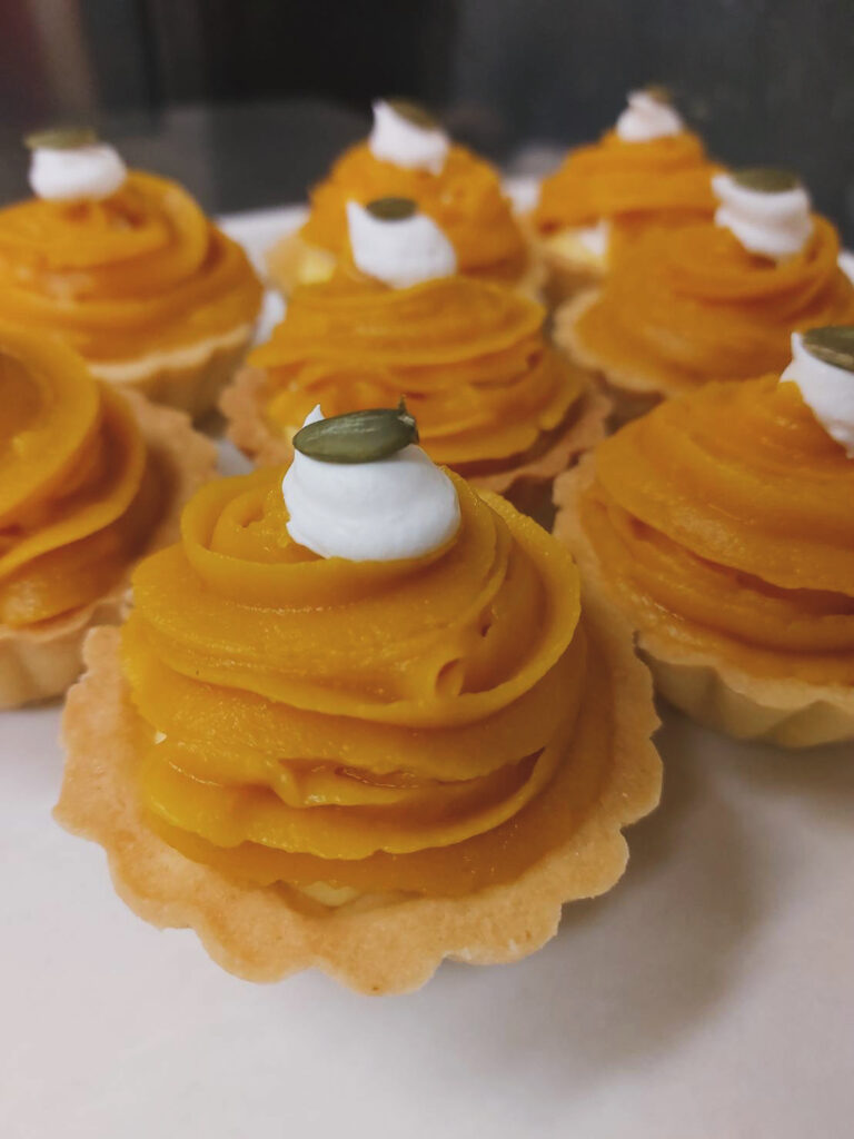 【かぼちゃのタルト】(写真下)自家製のタルト生地にバターケーキ・カスタードクリーム・生クリーム・かぼちゃクリームをのせた贅沢なタルトです